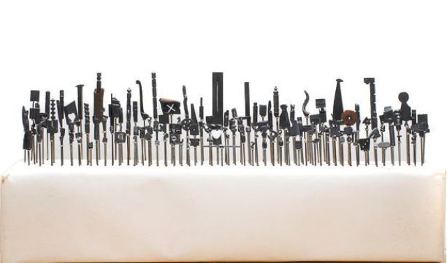 He shuns a magnifying glass and uses simple tools like razor blades and needles to create delicate little figures - from a tiny, jagged handsaw to a minibust of Elvis in shades.